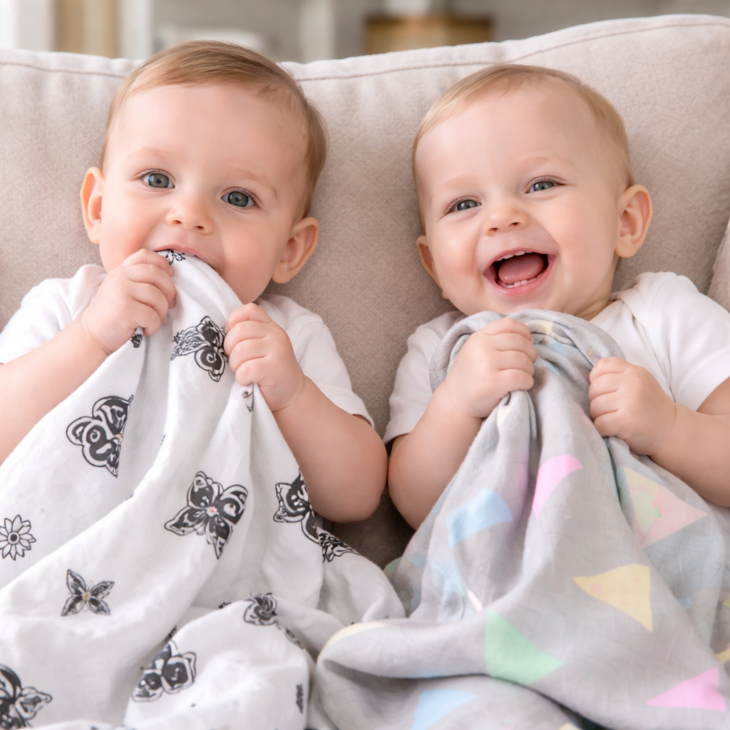Most parents find that 3–5 muslins is the ideal number for everyday use. You’ll use them for swaddling, feeding, spills, naps, outings, and bath time — so having a few on rotation makes life much easier.