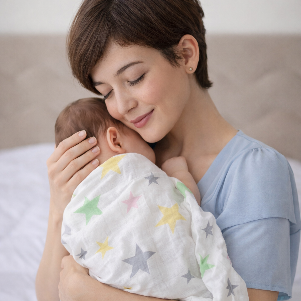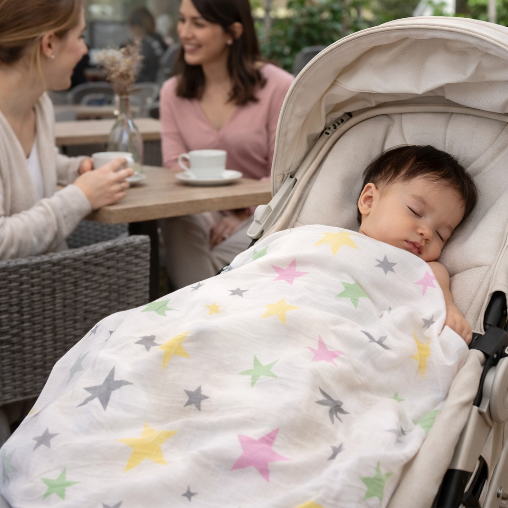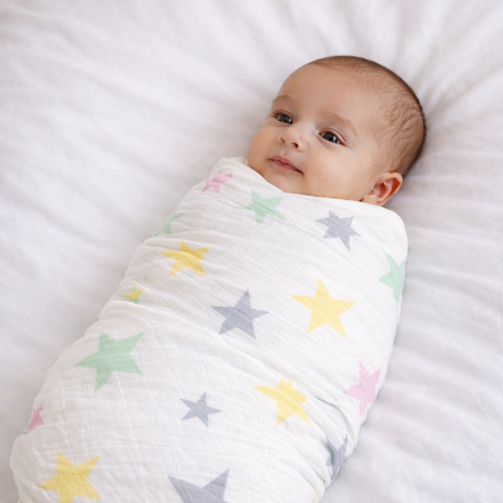 Our Cool Star Bamboo Muslin Swaddle is made from 100% bamboo muslin, designed to keep newborns comfortable without overheating. Naturally breathable and temperature-regulating, it’s ideal for sensitive and eczema-prone skin.